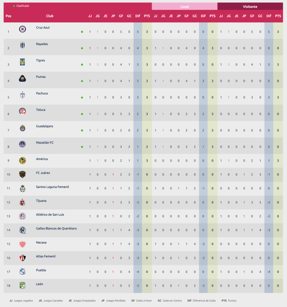 La gran sorpresa —y protagonista— de la primera jornada fue Cruz Azul Femenil. Las celestes, semifinalistas del Apertura 2025, arrancaron el torneo con una goleada histórica como visitantes tras imponerse 0-5 al León Femenil, resultado que las colocó como líderes de la clasificación gracias a su diferencia de goles.